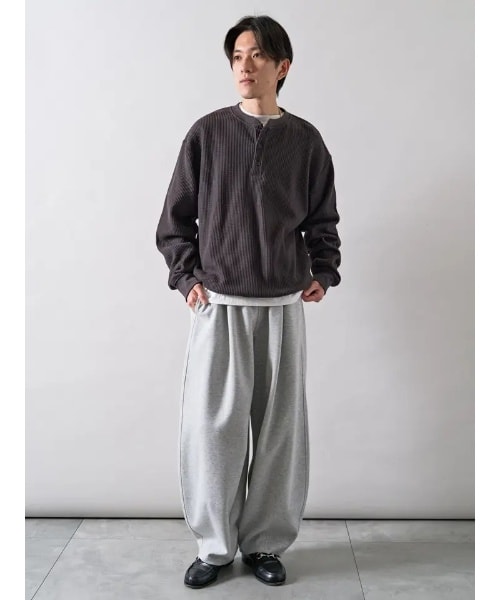 【着用サイズ いずれも:L】一見シンプルなヘンリーネックのアイテムですが、ワッフル生地を使用していて抜け感をプラスしてくれます。抗菌防臭機能も搭載しているのが嬉しいポイント◎