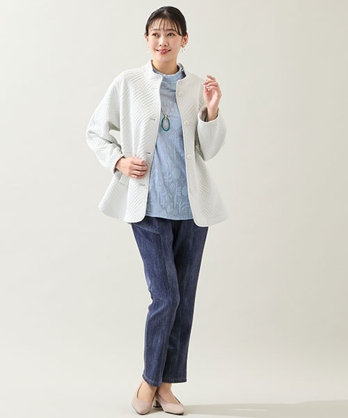 【大きいサイズ】甘さのあるライトカラーのジャケットにブルーのインナーを合わせた春のお出かけコーデ
