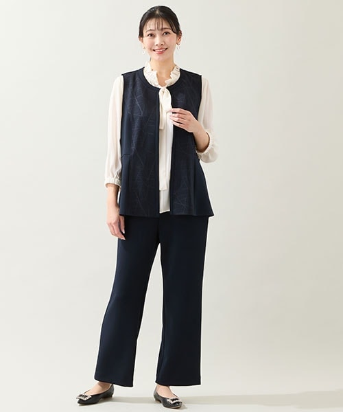 【大きいサイズ】ジャケットよりも軽快に楽しめるベストとパンツのセットアップコーデ。ボウタイブラウスでフェミニンさを添えるのがおすすめ!