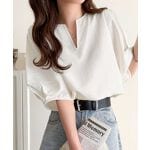 程よいボリューム感のランタンスリーブが 腕周りを華奢に見せ、女性らしさを演出♪ 接触冷感、吸水速乾、防シワ、UVカットの機能素材で、 デイリーに快適にお使いいただけます◎