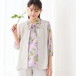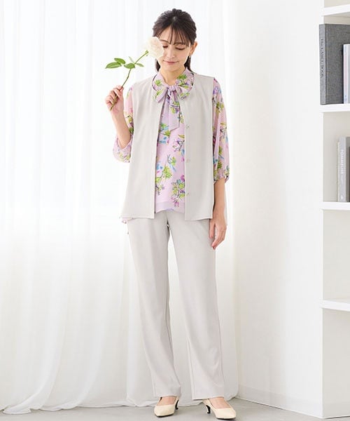 ベストとパンツのセットアップに花柄ブラウスをイン。女性らしく、きちんと感のあるオケージョンコーデです