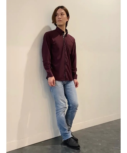 今回は00s風お兄系スタイルでレトロ回帰してみました♪ ビビットくるようなレッドカラーや前立てにフラワープリントされたデザインは個性的で◎。 シルエットは細身ですが、生地が柔らかくストレッチが入っているような着やすい仕様です。