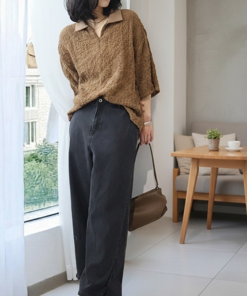 ポコポコ感のあるハーフジップのポロニットとグレーデニムのワイドパンツでまとめたトレンド感ある大人カジュアル。キレイめな佇まいに抜け感を添えたシンプルな着こなしは、休日に大活躍。どちらのアイテムも着心地も良く使える1枚です。
