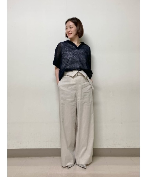 涼しく着られるコーディネートです。 メッシュニットと麻のハイウエストパンツは旅行やオフィスカジュアルにもオススメです。