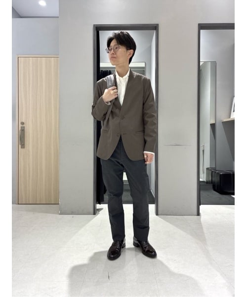 明るさを残しながら落ち着いた雰囲気を作れるので、ビジネスカジュアルやキレイめコーデにおススメのノーカラージャケットスタイル(Mサイズ着用)。