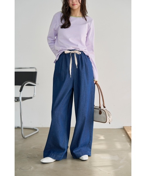 春らしいラベンダーと白のボーダーがポイントになった可愛い春のリラックスコーデ。