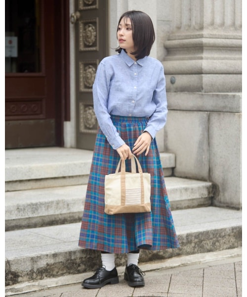 シワになりにくいフレンチリネンシャツを主役に。爽やかなブルーとチェック柄スカートで、上品で軽やかな春夏コーデ。