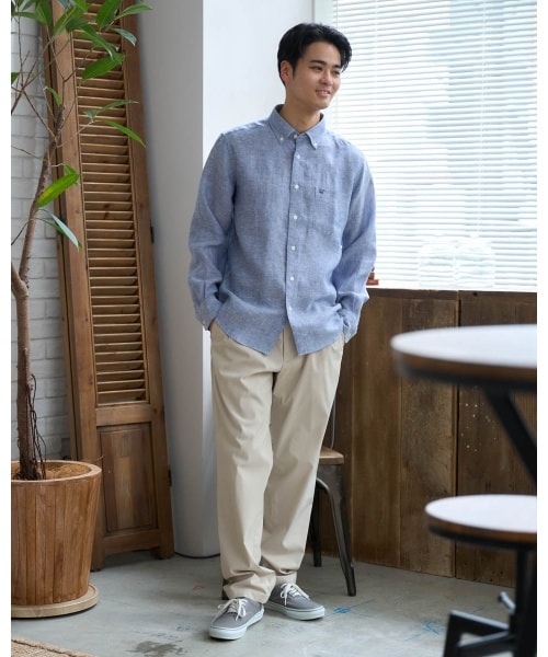 シワになりにくいフレンチリネンシャツで、涼やかで上品な印象に。ベージュパンツと合わせた、爽やかな大人のきれいめカジュアル。