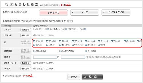 「色」「対象商品」も同様に、ご希望の条件にチェックを入れてください。これらも複数指定することが可能です。