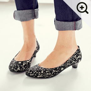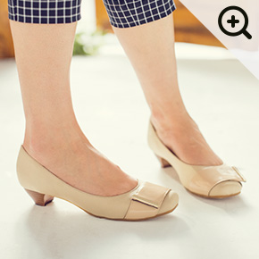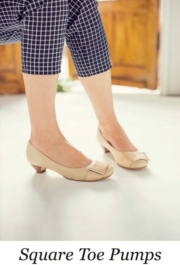 やわらかファブリック素材のスクエアトゥ。歩きやすい3.5cmヒールです。