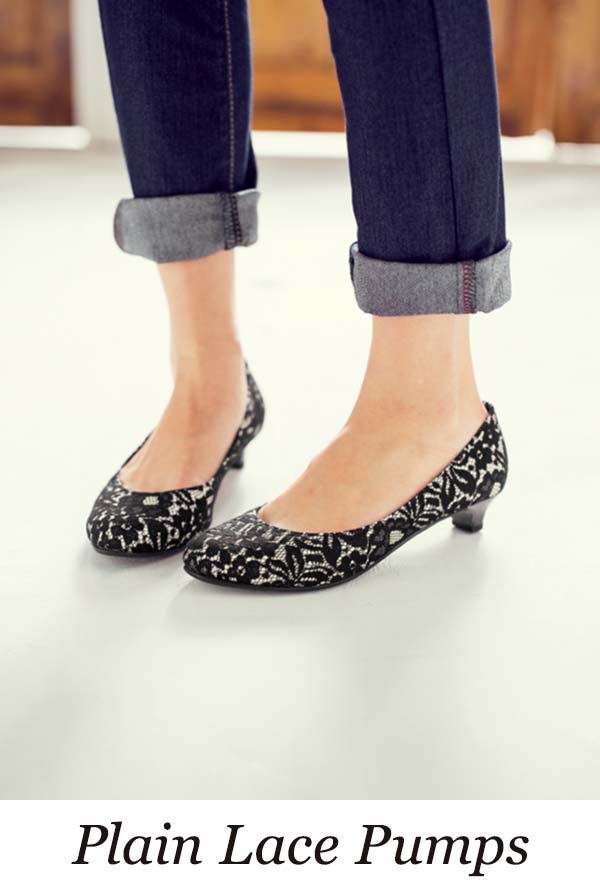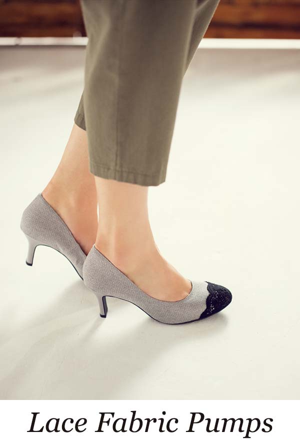 きれいめでも疲れにくいローヒール。プレーンなフォルムにレース素材が華やか。