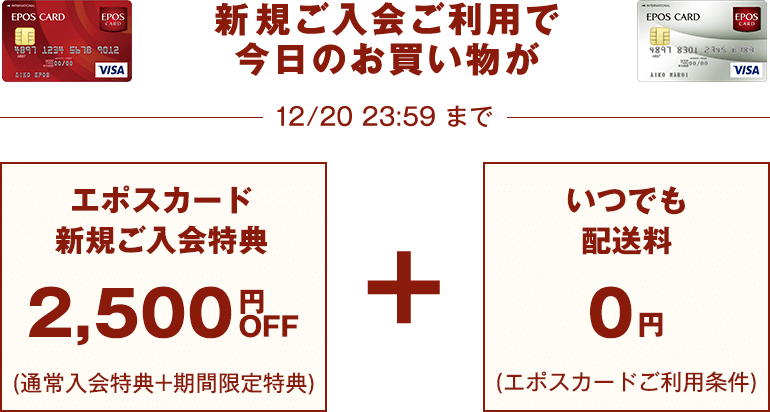 12月4日(金)0:00~12月17日(木)23:59の期間中、はじめてエポスNetIDによるログインで、Webクーポンをプレゼントいたします。<クーポン名称:エポスNetIDはじめてログインクーポン(5000円以上商品対象・エポスクレジット払い限定)>