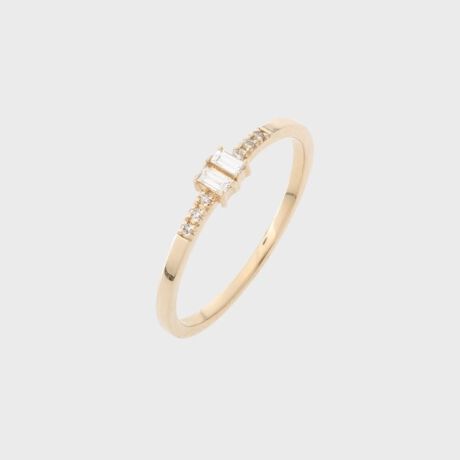 クラシカルな印象のバゲットカットダイヤをモダンな雰囲気にアレンジしたリング。ダイヤの輝きが美しく大人の女性にぴったりのアイテム。センターのバゲットカットダイヤと整然と並んだサイドのメレダイヤが上品に輝き指先をスッキリと魅せます。コーディネートを選ばずデイリーにご使用いただけるダイヤモンドリングは大切な方へのギフトジュエリーとしてもおすすめです。