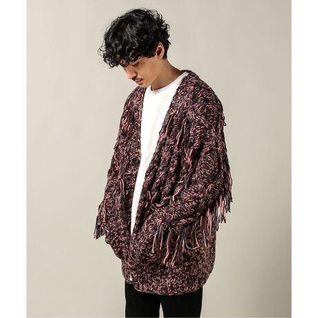 ミックスニットの配色と、部分使いされたフリンジが特徴の厚手のカーディガン。