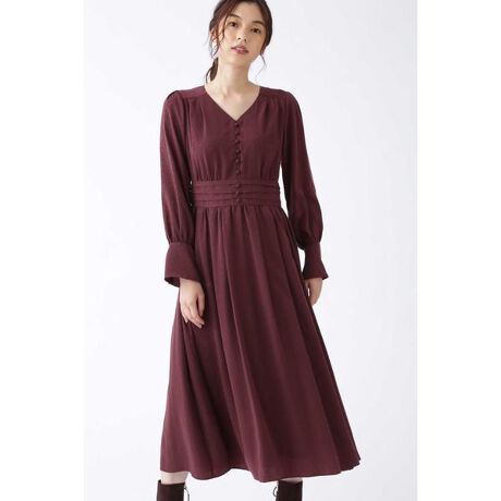 小花のジャガード織りデシンを使用した上品なワンピース。ポリエステル素材がシワになりにくく、一見すると無地見えする、さりげない柄が特徴です。太目に切り替えたウエストにはランダムタックを入れてメリハリのあるポイントに。ボリューム袖が可愛いポイントになり、カフスは少しフレアを出してスリットで抜け感をプラスしています。フロントは飾り釦を仕様、後ろファスナーで簡単に着脱できます。※裏地付き