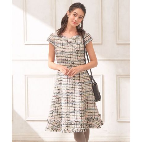クラレソンツイードを贅沢にもフレアシルエットのドレスにデザインしました。シンプルなデザインの中に裾にフリルをあしらって、フェミニンさをプラスしました。■同素材アイテム