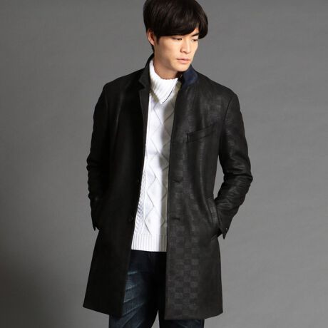 ロングジャケット風のシャープなシルエットが特徴のチェスターコートです。カットソーのジャージ素材を起毛してスウェード調に仕上げた素材を採用。マイクロファイバーを起毛した滑らかなタッチ感と光沢感、ストレッチの効いたジャージ素材です。カラー91はエンボス加工で毛並みを抑えてグレンチェック柄を表現しています。製品で撥水加工を施し、表生地に合わせてストレッチ裏地を採用した総裏仕様。地衿にワイヤーを仕込んでいますのでアクセントをつくれ、しっかり上まで釦止め出来る設定で防風性を高めています。ねじりの作用を入れた前振りのツイスト袖とジャストなサイズ感で綺麗なシルエットを作り、ストレッチの効いた着やすさを特徴にしています。