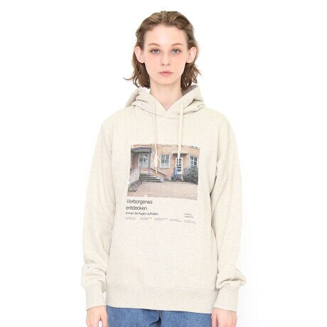 風合いの良い裏毛を使用したベーシック型のプルオーバーパーカー。蓄光の糸で刺繍されたおばけがポイントです。一見レトロな建物の写真を中心にしたフォトデザインと思いきや、よく見るとおばけがところどころに潜んでいます。ユーモアと遊び心に富んだ、楽しくかわいらしいグラフィックデザインです。「刺繍加工」※商品画像と実物では多少色味に違いがある場合がございますので予めご了承下さい。※発売日や販売状況は店舗によって異なります。
