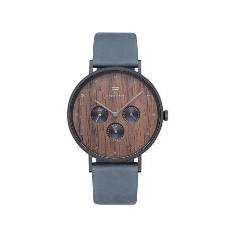 カレンダー、曜日、24時間表示機能を備えた多機能コレクション「CASPAR」。クロノグラフ風の3カウンターが配置された文字盤の素材には、天然木を採用しています。