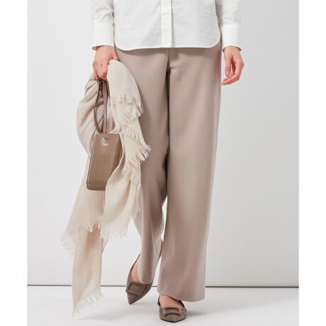 パンツのサイドに縫い目のないバイアスで仕立てた拘りの一枚です。両脇の縫い目を無くす事で綺麗なシルエットを実現し、ジャージのようなリラックス感のある雰囲気を醸し出しています。またバイアス地で仕立てる事で綺麗な落ち感を実現しています。ウエストゴムでゆったりとしたストレスフリーな着心地に、カジュアルすぎない上品さも併せ持った着まわしやすい一枚です。保温性が高く、肌触りも良く軽い着心地なので、冬の寒い時期には欠かせないアイテム。必須の定番色のブラック(#005)とカラーアイテムとの相性抜群のグレー(#004)に、冬らしい温かみのあるベージュ(#033)、コーディネートを明るくしてくれるアイボリー(#002)の4色展開です。