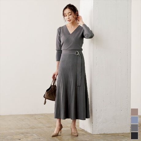 ・綺麗なシルエットが女性らしく、上品な印象を与えるカシュクールニットワンピース。