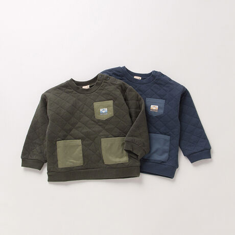 ふっくらと厚みをもったキルティング生地で表情豊かなルックスに仕上げたトレーナーです。アウトドアテイストの異素材ポケットがアクセントになり、おしゃれ指数を格上げ♪ ボトムスはシンプルにまとめて、風合いの良さを引き立たせた着こなしがオススメ。細菌の増殖を抑制する抗菌防臭加工もほどこしています。内側にはお名前を記入できるタグつきです。※80、90サイズのみ肩開き