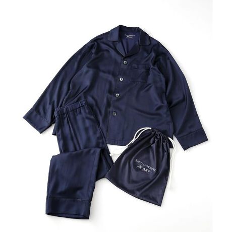 素材には肌触りとしなやかさが特徴のサテン素材を使用。開襟のデザイン、大きなボタンとパイピングでシックに仕上げ、ドロップショルダーに太めの袖、ゆったりしたリラックスシルエット、ウエスト部にシャーリングを入れストレスフリーに。ストレートシルエットにブラックパイピングを施し、ウィメンズ仕様と異なる変化を加えています。ペアで揃えて着ていただいてもよし、ブランドネーム入り巾着もセットになっている為、ギフトとしてもおすすめです。