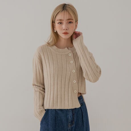 縦のリブ編みで、スリムなラインを演出して裾のアンバランスなくぼみディテールと斜線ボタンディテールがポイントとなるアイテムです。