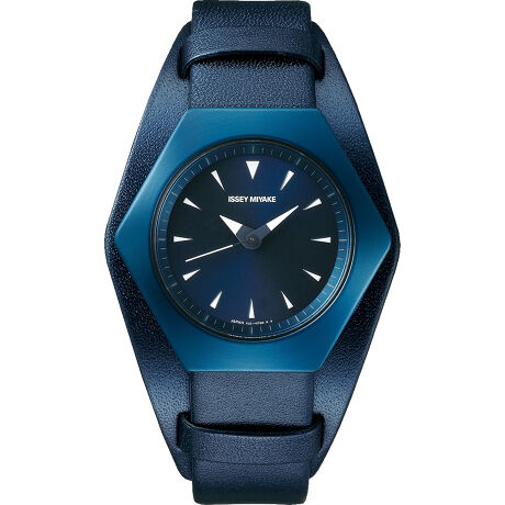 青メタリックの六角ケースにスタビライザー付きレザーストラップで装ったアイコニックさが特徴。