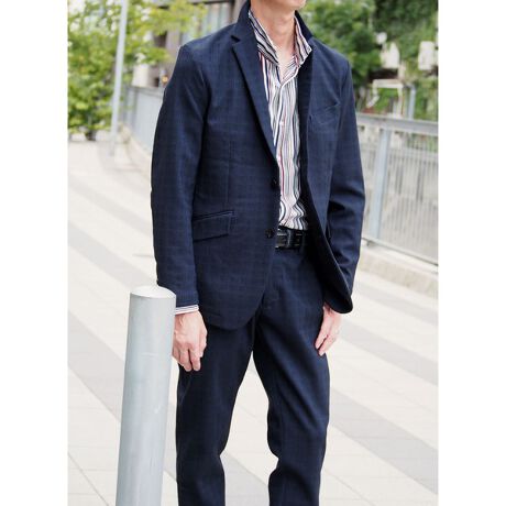 表面感のあるハケメ素材を使用した二つ釦タイプのラペルジャケット。ラペルの大きさと位置を変える事で少し大人っぽい印象に仕上げました。同素材のパンツ(ハケメ柄イージーパンツ[品番:0565−5133]も展開しているのでセットアップでのスタイリングが可能です。表地にはレーヨン糸とプリッとしたコシを出すナイロン糸を使用したハケメ柄のハイパーストレッチ素材を採用。しっかりとしたハリがありながらポリウレタン混による良く伸びるストレッチ性とキックバックが利いた素材感、合繊特有の上品な光沢感が特長の素材です。裏面に薄手のトリコットをボンディングする事で仕立て映えするハリ感、冬らしい肉感を出しました。生地の段階で撥水加工を施す事で悪天候の日でも着用出来るようにしております。