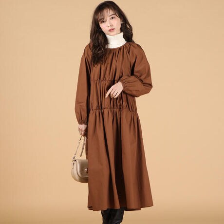 ギャザー使いの切り替えワンピース。ふんわりとしたルーズなシルエットが今年らしいワンピース。インナーにタートルをプラスしたりコーディネート次第で長い期間愛用出来そう。ウエストの締め付けがないのでストレスフリーな着心地が叶います★