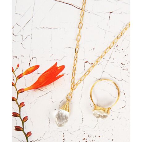 可愛い1粒天然石のネックレスとリングのセットアクセサリー。ワイヤーに包まれたクリスタルが揺れるシンプルなデザイン。