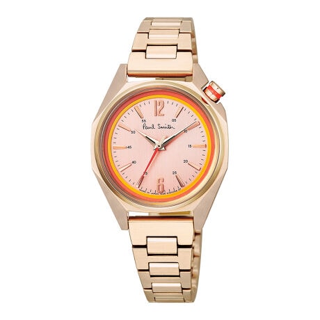 リュウズはアーティストストライプのカラーをアクセントに加えているのと共に、通常とは異なる位置に配置して「ひねり」を表現しています。