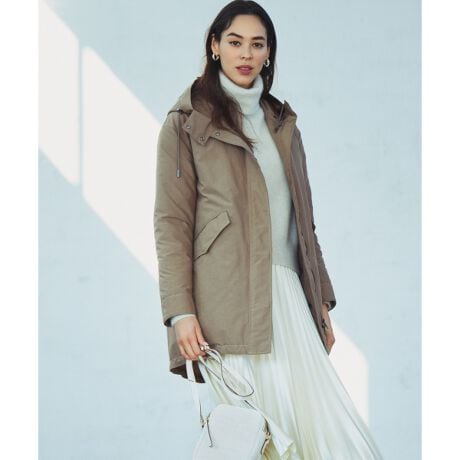 カジュアルとエレガンスが共存する大人のモッズコート。メンズライクなデザインで、あえて女性らしいアイテムと合わせるコーディネートがおすすめ。ヴィンテージライクな素材感がこなれた雰囲気を醸しだしてくれ、大きめのフードが顔周りを華奢にみせてくれます。内側にはダウン入りなので、暖かく寒さをしっかりと防いでくれます。ウエストと裾のドローストリングでウエストや裾を程よく絞ってスタイルUPに着こなしても◎ 柔らかな表情のパンツを合わせ軽快かつ上品なワントーンコーデで着ていただくのがおすすめです。ニュアンスカラーのベージュ(#033)とキャメル(#034)の2色展開です。