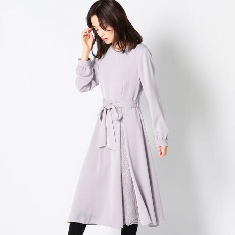 スカート部分がレース素材とのレイヤード切り替えになったワンピースです。ウエストには共布ベルトをつけ、適度なメリハリを演出。なめらかな生地にはほんのりツヤがあり、華やかさのある仕上がりを叶えます。