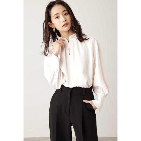 ピコカットのフリル襟がフェミニンなブラウス。ポリエステル素材を使用し、さらっと着られる風合いです。フリル襟とネックスリットや釦ディティール、太めカフスが上品なポイントです。1枚で着るスタイリングはもちろん、ニットとのレイヤードにも合わせられるデザインです。
