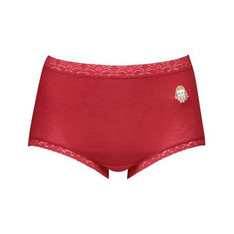 ・本体は脇接ぎがなく、やさしい肌あたり・本体はディアヒップショーツ【PPA112】と同設計・同素材・フクロウ(不苦労、福来郎…など縁起のよいといわれる)をかぶったネコ『ワコにゃん』モチーフのアップリケをあしらった赤いショーツで、ギフトにもおすすめの1枚