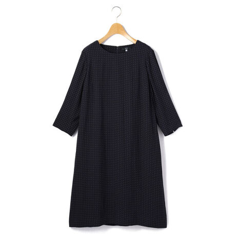 レトロなテイストのスクエア小紋柄をちりばめたクルーネックワンピース。すっきりと開いたネックラインがデコルテを美しく引き立て、女性らしい魅力を演出。裾に向かって緩やかに広がりをもたせた、きれいなAラインシルエットでデザインしています。袖口にはスリットを入れ、着脱のしやすさにも配慮しました。