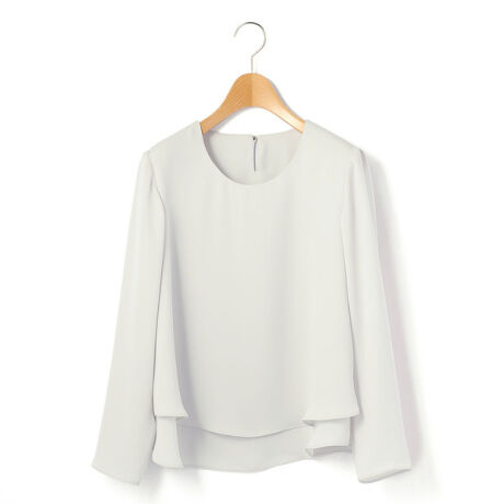 クルーネックタイプのロングスリーブブラウス。2枚重ねたようなレイヤードのディテールが、デザインのポイントになります。ソフトでドレープ感のある素材により、フェミニン度がUP。単品でもジャケットのインナーとしても重宝するトップスです。デイリーからフォーマルまで、幅広くご活用いただけるアイテムです。