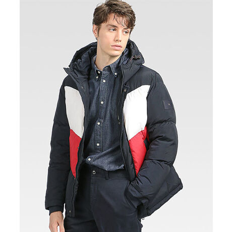 フラッグロゴからインスピレーションを受けたカラーブロックデザインのパファージャケット。