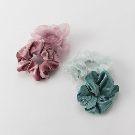 ベロア調の素材とシアーな素材をそれぞれ使用したシュシュの2個セットです。カラーコントラストを効かせたこだわりのデザインは、重ねづけするとさらなるおしゃれ見えが実現♪ ダウンヘアに合わせたり、アップヘアに合わせたりと、ヘアアレンジが楽しくなるようなアイテムです。