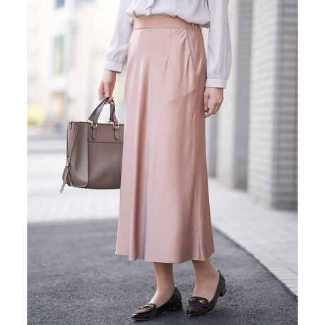華やかな光沢感がフェミニンな雰囲気抜群のスカート。ウエストにタックを取ることでお裾に美しい広がりを持たせた、メリハリのあるドレッシーなシルエットがポイントです。シンプルなワンカラーなのでトップスを選ばず、デイリーからちょっとしたお出かけまでお使いいただけます。ウエストはバックゴム仕様なのできちんと見えしながらリラクシーな着用感を実現。上品な雰囲気のミモレ丈スカートは一枚あれば様々なシーンに活躍するアイテムです。※サイドファスナー