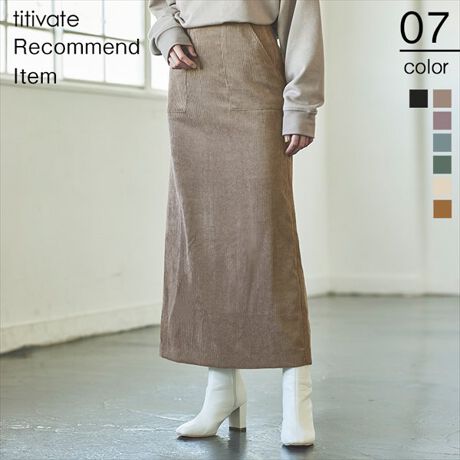 すっきりとしたIラインシルエットで大人カジュアルスタイルにぴったりなコーデュロイスカート。