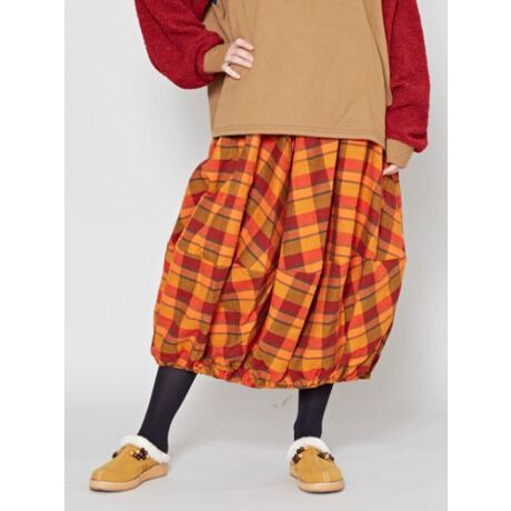 温かみのあるアクリル素材のチェック織り生地を使用したスカート。カラフルな色合いが、暗くなりがちな秋冬コーデを明るく彩ります。裾部分がゴムで技ありのバルーンシルエット。丸みのあるシルエットは穿くだけで可愛らしい印象に◎