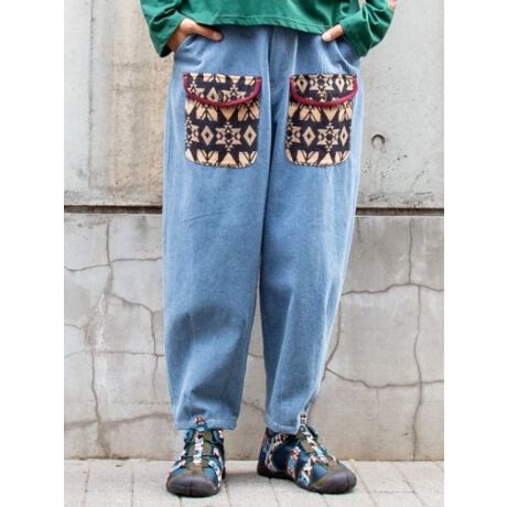星空の下、家族や仲間と焚き火を囲んで自然を感じる。そんなシーンをイメージしてデザインしたメンズパンツ。アウトドアを満喫できる厚手のデニム生地を使用。ネイティブ柄の織り生地が存在感を醸し出します。もちろんタウンユースでも大活躍!秋冬のカジュアルコーデやフォークロアスタイルに◎