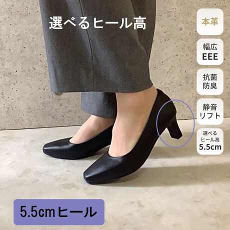 【5.5cmヒール スクエアトゥ 牛革 EEE プレーンパンプス】