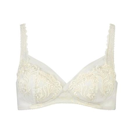 ・年齢による体型変化に対応した独自のパターン設計(アンダー部分全体にストレッチ性があるので圧迫感を軽減)・土台前中心の裏打ちに伸びない素材を使用することで土台くりのまるみを保ち、ハリとコシのあるカップ裏打ち素材と三枚接ぎ構造により、高いバストトップ位置とカップサイドすっきりを実現させ、前中心上辺からカップ上辺にかけたカシュクール構造でからだにフィットさせながらリフトアップ・優雅に流れる幾何学模様の刺繍レースの華やかなデザインがポイント