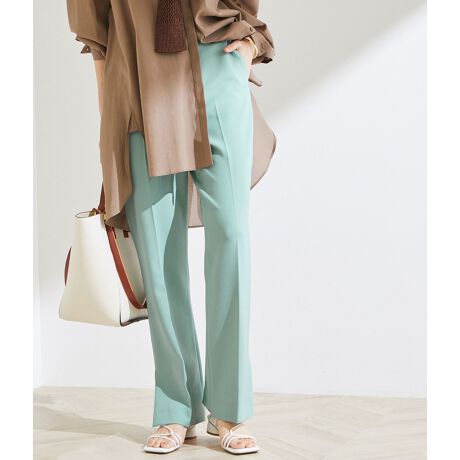 ハイウエストでヒップから太ももまではタイトめひざ下くらいからセミフレアになるニューシルエット。美脚をめざして作ったパンツはサイドスリット入りでヘムは前後差のある足長効果〇のデザインです。