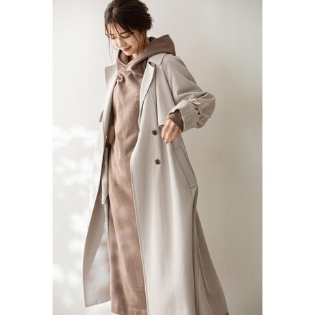 レーヨンコットンのツイル素材を使用したスプリングコートレーヨン混なので程よい落ち感があり、しっかりめの生地なので着映えする上品なアウターです。雨よけを長めにしており、ウエストを締めると雨よけが強調されて可愛いシルエットになります。開けて着てもバランスが良いように自然なAラインシルエットに仕上げ、袖はラグランスリーブで袖は少し太めにし、厚手のトップスを着てもストレスなく着られます。袖口にもベルトを付けて、締めたり緩めたりコーディネートによって調節して頂けます。早い時季から着られる背裏と袖裏付き、品の良い仕立ても特徴です。オリジナルカラーで染め上げており、鮮度のあるラベンダーとカジュアル過ぎない上品なベージュの2色展開です。