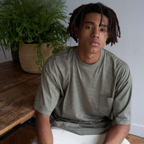 先染めした3配色の細かなボーダー柄が特徴的なベーシックなポケット付きTシャツ。